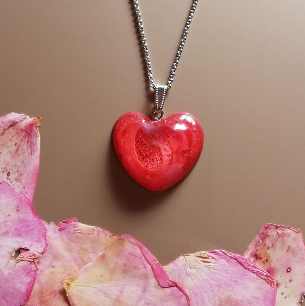 - Red Heart resin pendant necklace.