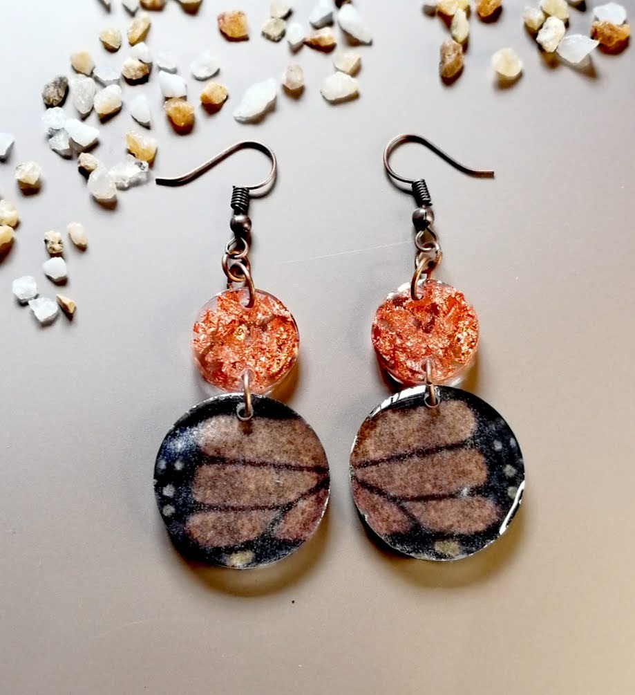 Two round resin discs, one filled with copper leaf and the other with a beautiful butterfly wing print.